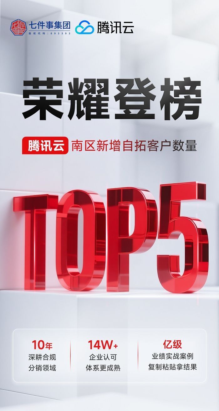 此次荣登「腾讯云」南区新增自拓客户 TOP5,既是市场对七件事集团服务能力的认可,也为双方深化合作奠定了基础。行业里的人分析,监管越来越严,市场竞争更激烈,具备合规基因的分销系统服务商将迎来更大增量空间。